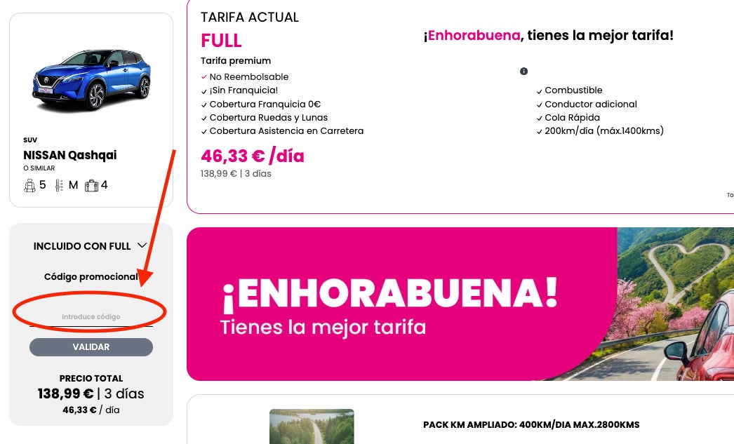 Al final del proceso de reserva, cuando llegues a la pantalla de resumen donde aparecen todos los datos, verás un campo para códigos promocionales. Pégalo o escríbelo ahí.
