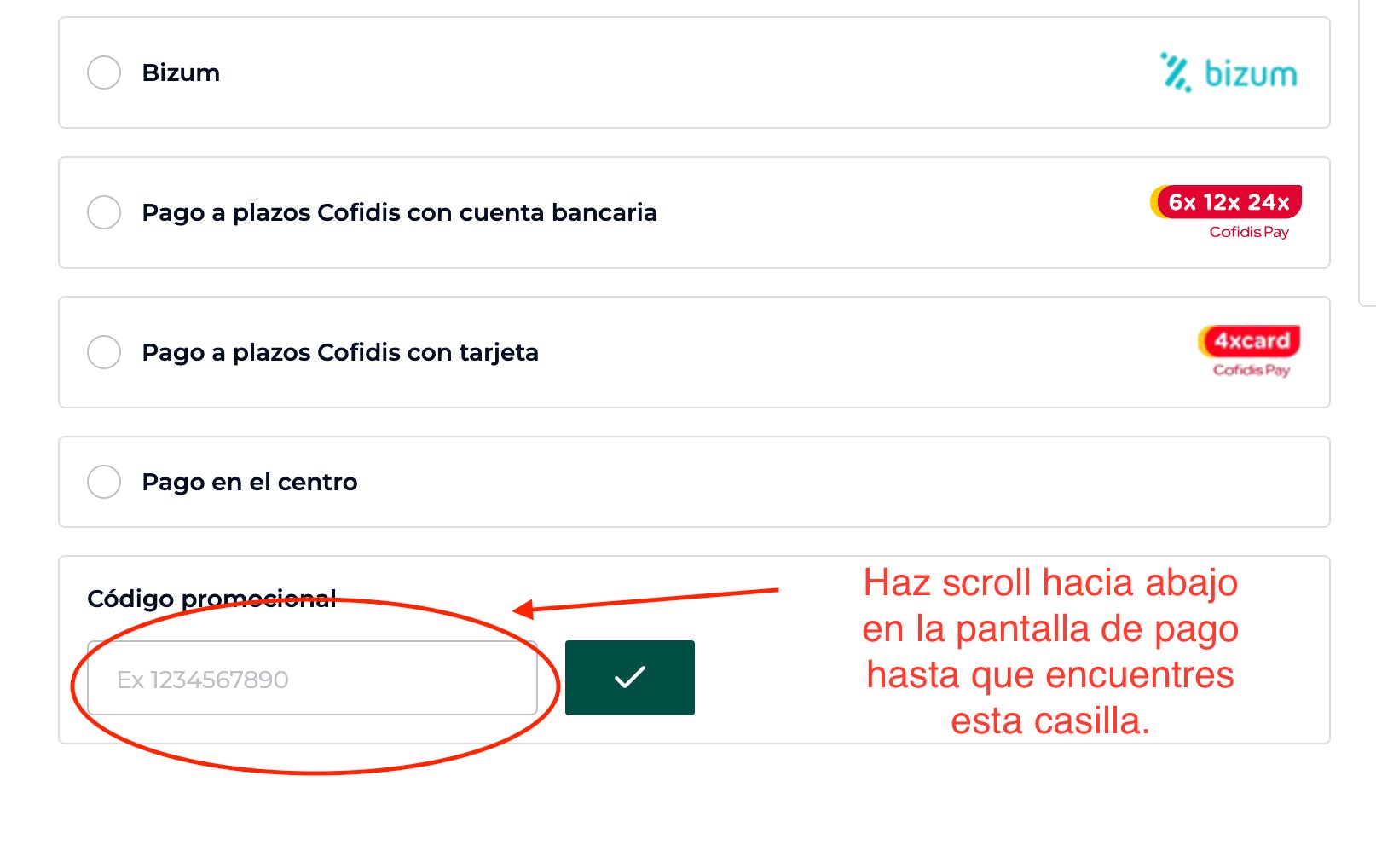 - Verás una casilla en blanco bajo el mensaje: "Código promocional".