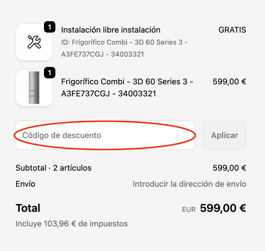 - Debajo tienes una casilla que dice "Código de descuento". Pega el cupón sobre esas palabras.