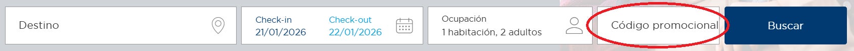 - Una vez en la homepage, encontrarás la barra de búsqueda donde introducir el destino, las fechas, el número de huéspedes y tu código promocional.